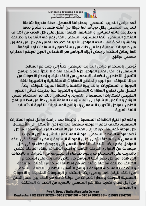 تُعد مراحل التدريب السمعي، بمحتواها المُفصل، خطة مُتدرجة شاملة للتدريب السمعي بكل درجاته، لما فيها من أمثلة مُتعددة تشرح بدقة و بطريقة قابلة للقياس و المتابعة، كيفية العمل على كل هدف من أهداف المنهج السمعي؛ تبعاً للمستوى السمعي الذي يقع فيه المُتدرب و بطريقة وافية، و لقد صُممت هذه المراحل التدريبية خصيصاً للعمل مع كل من يعانون من صعوبات سمعية بما في ذلك من يستخدمون السماعات أو القوقعة، كما يمكن استخدام بعض أجزاء البرنامج مع الأشخاص الذين لديهم اضطراب سمعي مركزي.