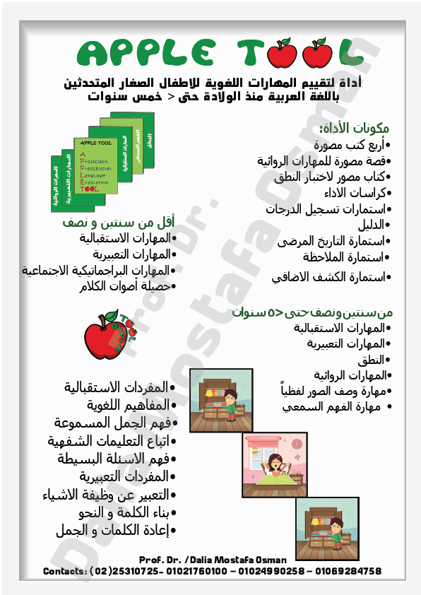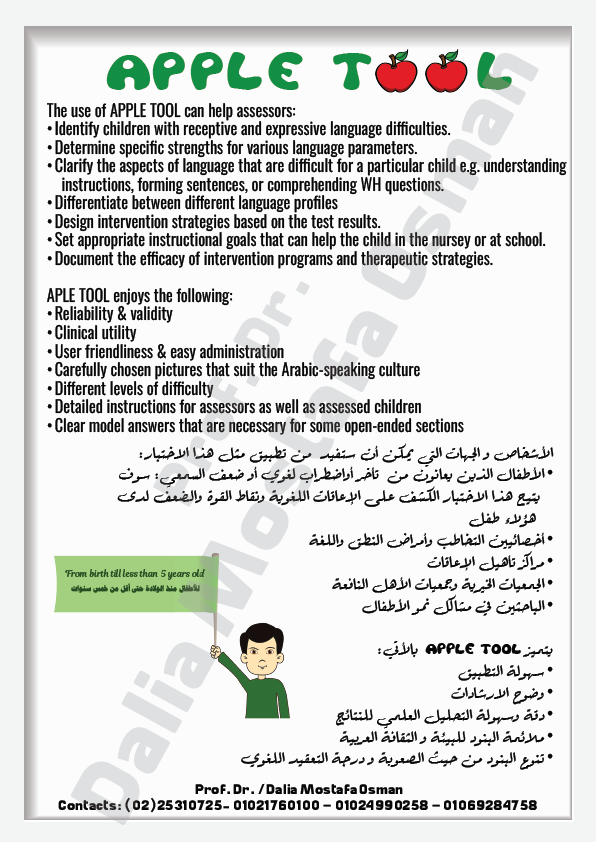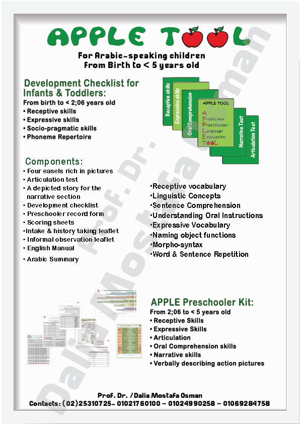 covers: (from birth to less than 2;06 years old) receptive, expressive, & socio-pragmatic aspects of language, it also includes a phoneme repertoire section