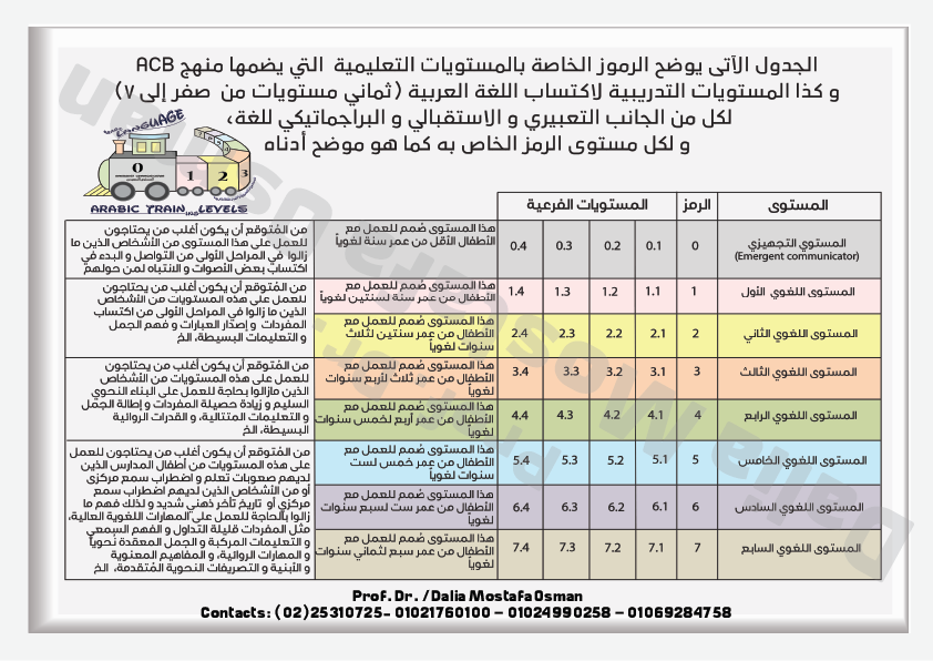 can be considered as tools for Arabic Curriculum Builder (ACB). The levels are rich in examples and pictures. In each level, every single constituent skill is explained and demonstrated in an easy-to-use way which makes it applicable and beneficial; not only for professionals, but also for parents and caregivers
