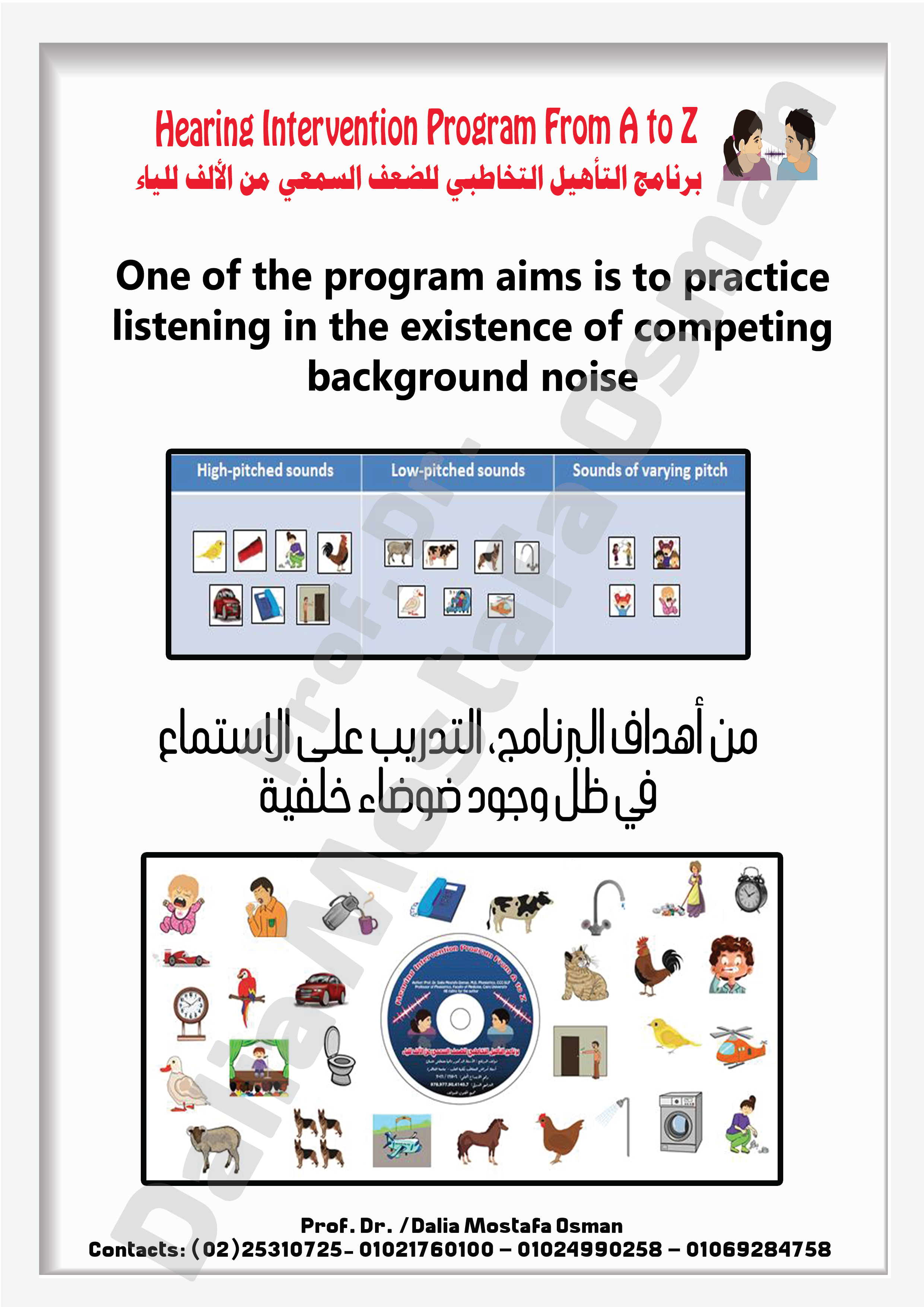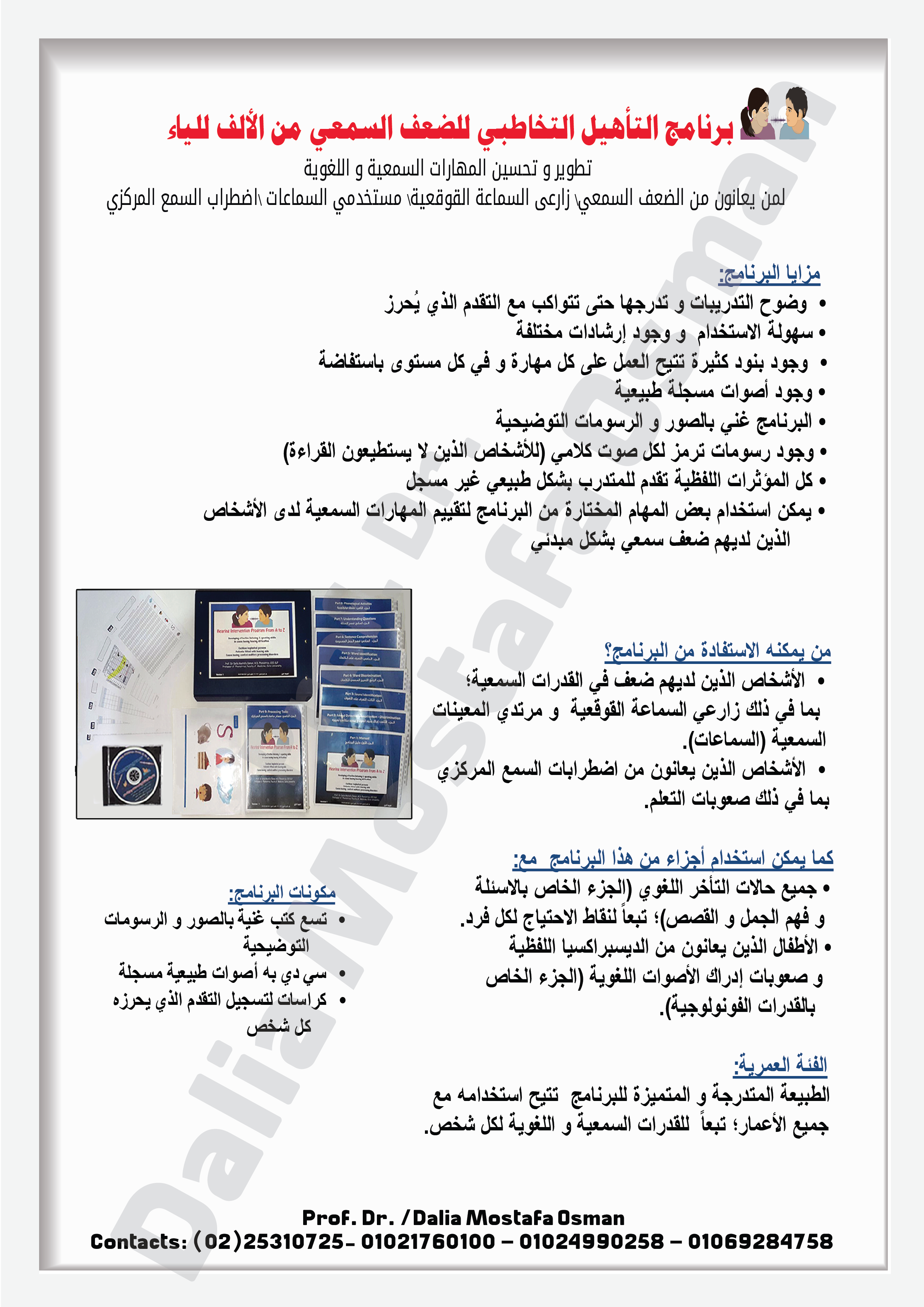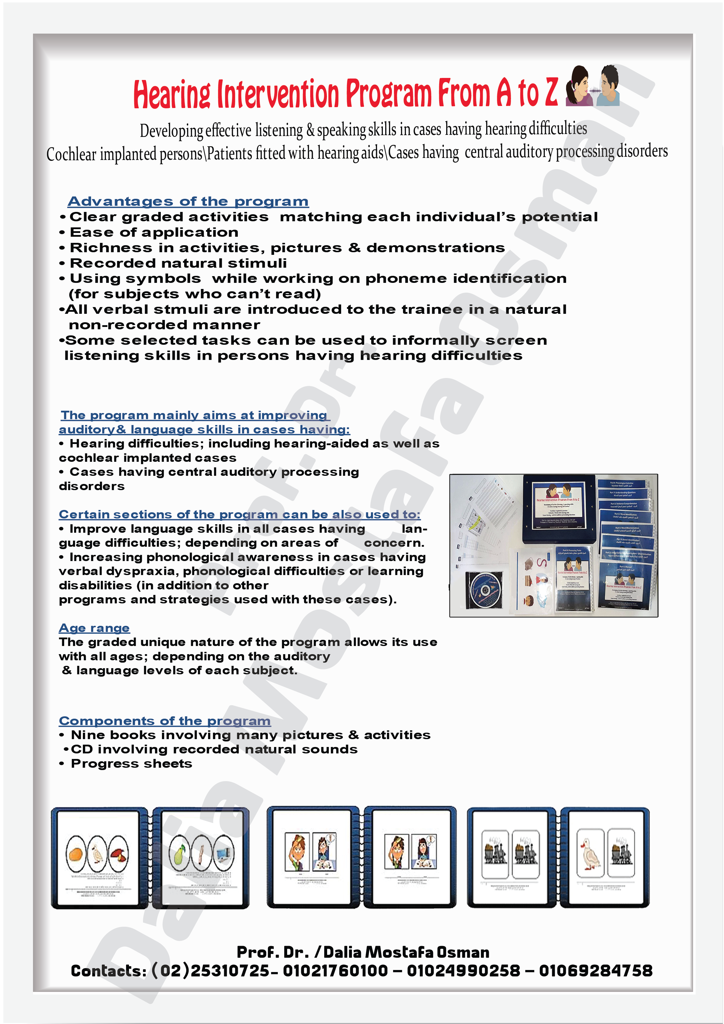 For all cases having hearing difficulties; whether cochlear implanted, wearing hearing aids, or having central auditory processing disorder. Certain sections can be used with cases having language difficulties